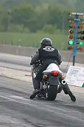 Drag racing or sprints is a racing venue where two participants line up at a dragstrip with a signaled starting line. Upon the starting signal, the riders accelerate down a straight, quarter-mile long paved track where their elapsed time and terminal speed are recorded. The rider to reach the finish line first is the winner. This can occur upon purpose built venues (e.g., Santa Pod), temporary venues (e.g., runways or drives of country houses). In addition to "regular" motorcycles, top fuel motorcycles using Nitromethane also compete in this category.