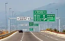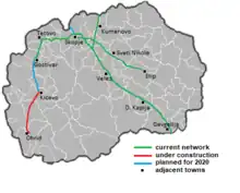 The system has inherited some from the former Yugoslavia, although new sections have been completely built in the recent years. Pay-tolls (Macedonian: patarini) remain in place and the speed limit is 130 km/h (81 mph).[1] The total length of the motorway network as of December 2020 is 317 km,[2] with extra 57 km being under construction. The works on the first couple kilometers of the motorway from Skopje to Kosovo's border started in 2020, while the Gostivar-Kicevo section is expected to start in 2022. Also there are plans to extend the A2 motorway from Trebenista to Kjafasan making a motorway connection to the border with Albania.[3] Furthermore, most stretches of the existing network have been reconstructed, so overall the Macedonian motorways are in decent shape[4]