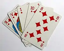 The game is played by three or four players using a pack of 32 French-suited cards. If three play, the Sevens are removed. The cards follow the Écarté scheme, ranking from highest to lowest as follows: K Q J A 10 9 8 7.