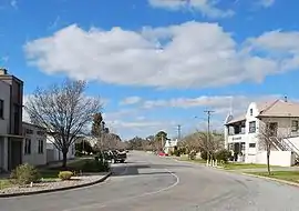 ![]() Morago Street, the main street of Moulamein, with the former Royal Hotel on the left and the Tattersalls Hotel on the right | |