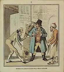 Mounseer Nongtongpaw is based on a popular 1796 song of the same name by the entertainer Charles Dibdin.[5] Dibdin's original song mocks English and French stereotypes in five eight-line stanzas, particularly "John Bull's" refusal to learn French. John Bull makes numerous inquiries to which he always receives the same response: "Monsieur, je vous n'entends pas" ("Monsieur, I don't understand you"), which he mistakenly interprets as "Mounseer Nongtongpaw". He comes to believe that the Palais Royal, Versailles, and a beautiful woman—the sights he sees while touring France—belong to this mysterious personage. When he comes upon a funeral and receives the same response, he concludes that all of Nongtongpaw's wealth could not save him from death.[1] Mounseer Nongtongpaw expands Dibdin's comic verses, adding more events to the narrative in shorter four-line stanzas, such as inquiries about a tavern feast, a shepherd's flock, a coach and four, and a hot-air balloon:[6]