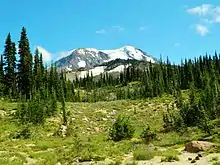 The 47,122-acre (19,070 ha)[49] Mount Adams Wilderness along the west slope of Mount Adams offers an abundance of opportunities for hiking, backpacking, backcountry camping, mountain climbing and equestrian sports. Trails in the wilderness pass through dry east-side and moist west-side forests, with views of Mt. Adams and its glaciers, tumbling streams, open alpine forests, parklands, and a variety of wildflowers among lava flows and rimrocks.[9] A Cascades Volcano Pass from the United States Forest Service (USFS) is required for activities above 7,000 feet (2,100 m) from June through September.[50]