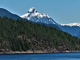 Mount Churchill is a 1,996-meter-elevation (6,549-foot) peak situated 100 kilometers (60 miles) northwest of Vancouver, in the Sunshine Coast region, and is part of the Coast Mountains.[1] Precipitation runoff from Mount Churchill drains to Jervis Inlet via Glacial Creek and High Creek. Mount Churchill is more notable for its steep rise than for its absolute elevation. Topographic relief is significant as the summit rises 1,996 meters (6,549 feet) above tidewater of Jervis Inlet in five kilometers (3.1 miles).