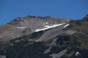![]() On the northern flank of Mount Hood, Barrett Spur, 7,863 feet (2,397 m), divides Ladd Glacier (center) from its eastern neighbor, Coe Glacier. | |