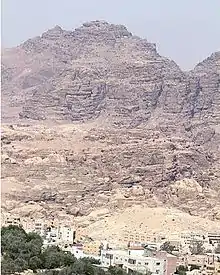 Based on the writing of Josephus,[1] it has customarily been identified with the Jebel Nebi Harun ("Mountain of the Prophet Aaron" in Arabic) or simply Jebel Harun, a twin-peaked mountain 4780 feet above sea-level in the Edomite Mountains on the east side of the Arabah section of the Jordan Rift Valley. On the summit is a mosque from the Mamluk period, traditionally marking the so-called "Tomb of Aaron" and built over the remains of a Byzantine church,[2] and in the saddle west of it are the remains of a Byzantine Monastery of Aaron.