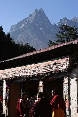 ![]() Monks of Tengboche Monastery drinking tea during the Mani Rimdu Festival, with Mount Khumbila in the background | |