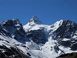 Other peaks in the Kunturiri massif are Pico Reya (5,495 metres (18,028 ft)), Qallwani (Yugoslavia) (5,492 metres (18,018 ft)) 2 km north of Kunturiri, Wintanani (5,428 metres (17,808 ft)), Pico Eslovenia (5,381 metres (17,654 ft)), Pequeño Alpamayo (5,370 metres (17,618 ft)), Pico Medio (5,355 metres (17,569 ft)), Ilusión (5,330 metres (17,487 ft)), Aguja Negra (5,290 metres (17,356 ft)), Jist'aña (5,260 metres (17,257 ft)), Diente (5,200 metres (17,060 ft)), Ilusioncita (5,150 metres (16,896 ft)), Tarija (5,060 metres (16,601 ft)) and Titicaca (4,968 metres (16,299 ft)).[8] The Spanish names of the peaks do not occur in the maps of the Bolivian IGM (Instituto Geográfico Militar).[1][9]