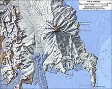 A 1-kilometre-wide (0.62 mi)[31] crater or caldera[9] sits at the top of the volcano. The highest point of the volcano lies east-northeast of the caldera and reaches 2,733 metres (8,967 ft) elevation.[32][lower-alpha 4] The caldera has an incomplete rim and is filled with snow, leaving a 500-metre-wide (1,600 ft) depression.[34] The rim of the caldera is covered by volcanic ejecta including lapilli and lava bombs, probably the products of the most recent eruption,[35] which overlie a 15-metre-thick (49 ft) layer of pumice lapilli.[36] Three small, nested craters[37] formed by phreatomagmatic eruptions occur on the southern rim of the summit caldera.[1] Pyroclastic fall deposits crop out in the northern rim of the caldera[19] and there are more alternating lava-tephra sequences elsewhere in the summit region. There is evidence of past structural instability (collapse structures) on the eastern and southeastern flanks,[38] and an arcuate (with the shape of an arc) 50-to-100-metre-high (160 to 330 ft) scarp on the eastern flank appears to be an incipient sector collapse.[36]