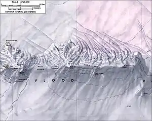 Mount Moulton is formed by a 40-kilometre-long (25 mi) complex of glaciated but largely uneroded[8] shield volcanoes[14] with two or possibly three[17] ice-filled calderas,[8] each of which is about 5–7 kilometres (3.1–4.3 mi) wide.[12] The calderas are 8 kilometres (5.0 mi) apart[14] and located at the Prahl Crags, Britt Peak and potentially Kohler Dome localities.[12] Additionally the Prahl Crags – remnants of the former caldera rim – are found south, Gawne Nunatak west, Edwards Spur northeast and the Moulton Icefalls on the northern side of the mountain.[8] The total volume of the complex is about 325 cubic kilometres (78 cu mi),[14] comparable to that of Mount Shasta in the Cascade Range, and is one of the largest volcanoes in the Flood Range and Ames Range.[9] Only the western part of the Mount Moulton emerges from the ice.[18]