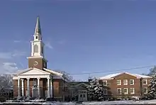 The 1870 meetinghouse was remodeled in 1875 and remained until 1897 when a larger church was built. In 1920, an education wing was added to the south side of the building and the bell tower and vestibule were relocated. After the Second World War, rapid population growth in the area spurred the construction of a larger church. Construction completed in 1949 added a new sanctuary, a social hall and a kitchen, as well as the stylized tall steeple that adorns the church to this day.