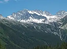 Mount Rogers, is a 3,169-metre (10,397-foot) massif located in Glacier National Park in the Selkirk Mountains of British Columbia, Canada. Mount Rogers is situated at the north end of the Hermit Range, and is the highest point of the range.[3] Its nearest higher peak is Mount Sir Donald, 12.57 km (7.81 mi) to the southeast.[3] The peak is prominently visible from eastbound Highway 1, the Trans-Canada Highway at Rogers Pass. The Rogers massif includes five individually-named summits: Rogers Peak, Grant Peak, Fleming Peak, Swiss Peak, and Truda Peaks.[4] Numerous glaciers radiate from all sides, including the Rogers Glacier, Swiss Glacier, Tupper Glacier, and Hermit Glacier.