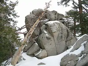 ![]() Rock formation and trees seen from Round Valley trail in winter | |