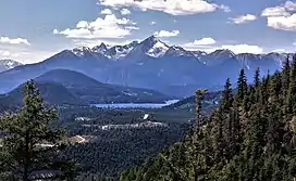 Mount Sloan is the sixth-highest peak in the Thiassi Range which is a subrange of the Coast Mountains.[1] The remote mountain is situated 50 km (31 mi) north of Pemberton and 11 km (7 mi) west of the historic gold-mining community of Bralorne. Precipitation runoff from the peak drains north to Downton Lake which is a reservoir of the Bridge River. Mount Sloan is more notable for its steep rise above local terrain than for its absolute elevation as topographic relief is significant with the summit rising over 1,960 meters (6,430 ft) above Downton Lake in 5 km (3.1 mi). Mount Penrose rises to the north on the opposite side of the lake.