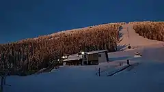 The ski area was originally on the west side of the mountain with rope tows and operated the world's first double chairlift in 1947,[14] converted from a mine tramway from Wallace, Idaho,[15] with a lodge built by the CCC the late 1930s.[16][17][18][19] A one-fatality fire in the nearly-completed lodge addition in January 1952[20] began the move to the east slopes.[21][22] A new day lodge (#1) was built by the state[23] on the east side and a Riblet double chair was installed in the summer of 1956.[24][25][26][27] A second was added five years later,[28][29] and a third in 1970.[30][31][32] The fourth chair was added a few years later, the fifth in 1977[33][34] and the sixth in 2018.[35] Night skiing on Mount Spokane began 55 years ago in December 1967.[36]