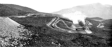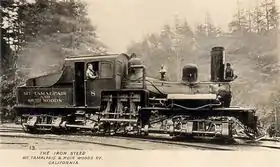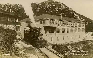 The Mount Tamalpais & Muir Woods Railway was a scenic tourist railway operating between Mill Valley and the east peak of Mount Tamalpais in Marin County, California, covering a distance of 8.19 miles (13.18 km), with a 2.88-mile (4.63 km) spur line to the Muir Woods.[1] The railroad was incorporated in January 1896, and closed in the summer of 1930.[2] Originally planned as a 4 ft 8+1⁄2 in (1,435 mm) standard gauge electric trolley line, the railroad was powered by a succession of geared steam locomotives.[3] Billed as the "Crookedest Railroad in the World," the line was renowned for its steep and serpentine route, winding through picturesque terrain to a mountaintop tavern providing first-class hospitality and panoramic views of the San Francisco Bay Area.[4] Despite its popularity, the railway met its demise following a fire in 1929,[5] and dwindling ridership when the automobile could finally drive to Tamalpais' summit.[6]