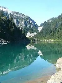 Mount Tom Taylor is frequently accessed from Bedwell Lake and the Bedwell Lake Trail. A trail starts between Baby Bedwell Lake and Bedwell Lake, in a sharp bend in the Bedwell Lake Trail. The trail heads west, then south, roughly following the edge of Bedwell Lake. It climbs steeply to meet Mount Tom Taylor's NE ridge at an unnamed lake.