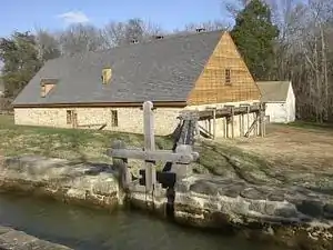 The lower garden, or southern garden, is bordered on the east by the storehouse and clerk's quarters, smokehouse, wash house, laundry yard, and coach house. A paddock and stable are on the southern border of the garden; east of them, a little down the hillside, is the icehouse. The original tomb is located along the river. The newer tomb in which the bodies of George and Martha Washington have rested since 1831 is south of the fruit garden; the slave burial ground is nearby, a little farther down the hillside. A "Forest Trail" runs through woods down to a recreated pioneer farm site on low ground near the river; the 4-acre (16,000 m2) working farm includes a re-creation of Washington's 16-sided treading barn.[26]