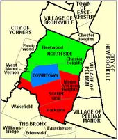 Mount Vernon is bordered by the village of Bronxville and city of New Rochelle to the north, by the town of Pelham and village of Pelham Manor to the east, by the Hutchinson River and the Eastchester and Wakefield sections of the Bronx to the south, and by the city of Yonkers and the Bronx River to the west.[28]