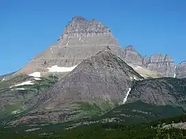 Like other mountains in Glacier National Park, the peak is composed of sedimentary rock laid down during the Precambrian to Jurassic periods. Formed in shallow seas, this sedimentary rock was initially uplifted beginning 170 million years ago when the Lewis Overthrust fault pushed an enormous slab of precambrian rocks 3 mi (4.8 km) thick, 50 miles (80 km) wide and 160 miles (260 km) long over younger rock of the cretaceous period.[7] The bulk of the peak is composed of limestone of the Siyeh Formation, and the conspicuous dark band is a diorite sill.[8]
