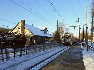 ![]() An afternoon train leaving Mountain Avenue station in February 2015. The 1893 station depot, constructed by the Erie Railroad is on the left. | |||||||||||||
