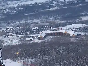 On October 10, 1999, the 31-year-old Vernon base lodge was destroyed in a fire just weeks before the 1999-2000 ski season. A temporary complex of prefabricated tents was quickly constructed in order to continue operations for the upcoming season. The tent complex included a food court, restaurant and bar and numerous rental and retail shops. While Intrawest originally planned to replace the complex after one year, plans for a new base lodge were put on hold for an unspecified reason. The decaying tent complex remained operational for approximately 13 years through the 2010–11 ski season before being replaced by a permanent lodge named the Red Tail Lodge.