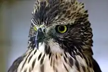 Though it is not considered a globally threatened species, the mountain hawk-eagle is never more than uncommon to rare locally. It occurs over a rather large distributional range that apparently extends over 19 million square kilometers. However, in estimations from the late 1990s, it was considered doubtful that the density of mountain hawk-eagle was high enough to reach 10,000 individuals, even with the now-separated Legge's hawk-eagle included at that time and all juveniles.[6] High levels of various habitat degradation and deforestation is probably the primary driver of declines throughout the range. In particular, the increasing density of human populations in northern India, southeastern China and Japan are likely to continue to facilitate declines in forest quantity and quality.[6][12][95][96][97] Likely more localized and minor threats from humans are persecution as occasional killers of domestic poultry. Despite their popularity in Asian falconry, it is unlikely gathering of hawk-eagles for this is a significant problem.[12][98] Lead poisoning from consuming carcasses of sika deer, left there by human hunters using lead bullets, have resulted in the death of some mountain hawk-eagles.[67] Mountain hawk-eagles may be vulnerable to viruses and helminths as well.[99][100][101] Similar threats are faced by all Nisaetus hawk-eagles, with only the changeable hawk-eagle shown to be resilient to human interferences and not in decline at the species level.[1][25] The Japanese population of mountain hawk-eagles is particularly showing signs of decline. In the 1990s, the Japanese population was estimated at 900–1,000 total individuals and may have reduced even more so today from that figure.[1][6][13][102][103] As the species is a K-strategist like all eagles, it was feared that the ongoing population reduction of N. n. orientalis might lead to loss of genetic diversity, and consequently inbreeding depression. However, genetic diversity was shown to be still considerable at present.[13]
