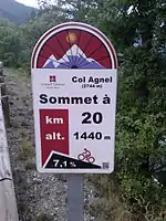 | Col Agnel from Château-Queyras uphill only | 2,744 m (9,003 ft) | France | 0.1% | ![]() Summer 2014 | Emblem:Conseil général Hautes Alpes; 2744 m: height of summit; A QR code is included in the lower right. |