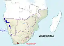 Range map of Equus zebra zebra in red and Equus zebra hartmannae in blue