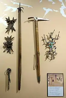 Eckenstein was also a pioneer in developing new equipment and climbing methods. He started using shorter ice axes which could be used single-handed, designed the modern crampons and improved on the nail patterns used for the climbing boots.[32]