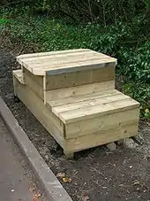 Mounting blocks were usually made from stone or wood and prior to the era of the motor car they were very common. Some have three or more steps leading up to a platform which gave extra height and therefore easier access to the saddle and less chance of falling when dismounting.[5] A few had a wall or some other support to one side of the steps, as at Saint Boswells.[6] Some were built as memorials and bear inscriptions.[4] They were built with bricks, ashlar and even occasionally from a single stone block,[4] whilst an example at Shewalton Mill in North Ayrshire is a glacial erratic boulder located in the mill yard.