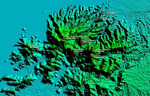 The mountain range consists of two prominent extinct volcanoes, namely Mount Palay-Palay at 688 metres (2,257 ft) high and Mount Mataas-na-Gulod, 642 metres (2,106 ft) high.[5] Mount Palay-Palay, located in the park's northern portion, covers sixty percent of the protected area.[3] A major attraction in the park is Mount Pico de Loro at the southern portion which was named for the towering formation at its summit which resembles a parrot's beak.[6] It is also the highest mountain in Cavite at 688 metres (2,257 ft) [5] where hikers are rewarded with scenic views of Manila Bay and its islands, and South China Sea, as well as the coves and beaches of Nasugbu including Mounts Batulao and Carilao (Talamitam). Other notable peaks in the mountain range include Mount Marami, Mount Buntis and Mount Nagpatong where the Filipino revolutionary Andres Bonifacio was executed in 1897,[7] and Mounts Kalanggaman and Dos Picos at the center of the protected landscape.[5]
