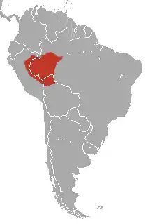 Moustached tamarins are inhabitants of tropical rainforests in Brazil, Bolivia and Peru.[4] They live in arid, upland forests in the Amazonian lowland, mostly occupying higher tree branches. The home range of moustached tamarins is between 25 and 50 hectares.[3]