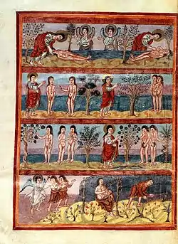 The Moutier-Grandval Bible is an illuminated manuscript bible of about 840, which was probably written in Tours, France, perhaps specially for the abbey. It was owned by them until the dissolution in the French Revolutionary Wars, when it was apparently forgotten and found in Delémont by children. It is now in the British Library (MS Addl. 10546). There are three full pages with miniatures, two showing scenes from the Book of Genesis: the story of Adam and Eve over several registers like a "strip cartoon", Moses receiving the Tablets of the Law and teaching them to the Israelites in two scenes, and an allegorical page with two scenes at the end of the book.[5] A facsimile was published in 1971 (Die Bibel von Moutier-Grandval, ed. J. Duft, Bern 1971).