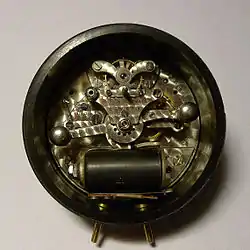A mechanical movement contains all the moving parts of a watch or clock except the hands, and in the case of pendulum clocks, the pendulum and driving weights. The movement is made of the following components:[2]