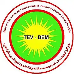 The Movement for a Democratic Society (Kurdish: Tevgera Civaka Demokratîk, TEV-DEM,[1] Arabic: حركة المجتمع الديمقراطي, Classical Syriac: ܙܘܥܐ ܕܟܢܫܐ ܕܝܡܩܪܐܛܝܐ, romanized: Zaw'o d'Kensho Demoqraṭoyo[2]) is a left-wing umbrella organization in northern Syria founded on 16 January 2011 with the goal of organizing Syrian society under a democratic confederalist system.[3][4] TEV-DEM is currently chaired by co-chairs Zalal Jagar and Kharib Heso.[5]