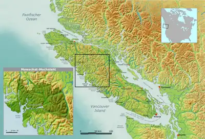 Their main reserve is at Gold River, British Columbia but the Mowachaht are originally from Yuquot on Nootka Sound, known to history as Friendly Cove, scene of the Nootka Incident and, later, the negotiations and eventual implementation of the Nootka Conventions between Britain and Spain, hosted by the Mowachaht chief Maquinna.[1]
