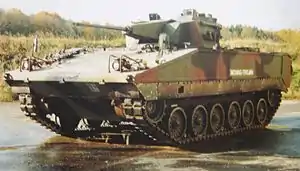 The AIFV (armored infantry fighting vehicle) Mowag Trojan was built as a prototype and tested in the New IFV program NSpz (Neuer Schützenpanzer) for Switzerland in 1990. The NSpz was intended to replace the M113 used by the Swiss Army. It was first equipped with the Steyr SP 3E/300 turret, and later with the Oerlikon GBA COA turret. It was equipped with various technological innovations such as outside lying fuel tanks, preheating and heating system, compartmentalized additional armor on the sides, which could be easily upgraded, splinter protection in the interior and s hydraulic rear ramp with integrated door and side protection. Due to financial shortages in the military budget, procurement should be begin with almost 10 years delay. MOWAG was not able to keep the production for the Trojans so long unused. Mowag participated no more in the second, later selection of NSpz, now called Schützenpanzer2000 (SP2000) in 1998 to 1999. The Swiss Army then purchased the Swedish CV90. The Trojan was the last tracked vehicle made by the company MOWAG . The Trojan was until 2005 owned by the company MOWAG. It is now at the Military Museum Full. [1] [2]