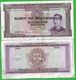In 1914, provisional issues for 100 and 1000 escudos were introduced, alongside regular issues for 10, 20 and 50 centavos, by the Banco Nacional Ultramarino. Emergency issues of notes for 10, 20 and 50 centavos and 1 and 2+1⁄2 escudos were introduced in 1920, followed by regular issues for 1, 2+1⁄2, 5, 10, 20, 50 and 100 escudos. Emergency issues for 50 centevaos and regular 500 and 1000 escudos notes were introduced in 1941. In 1976, 50, 100, 500 and 1000 escudos notes of the Banco Nacional Ultramarino were overprinted with the name of the new issuing bank, the Banco de Moçambique.