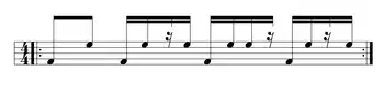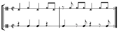 The NY Mozambique bell is nearly identical to the basic songo stick pattern.[13] [See: "Basic Songo for Drum Kit" (Ignacio Berroa). The only difference is the stroke on main beat 3, sounded in the songo pattern. Both songo and NY Mozambique departed from the typical "angular" rhythms used in son montuno, mambo, and salsa, allowing more improvisational freedom for the conga drummer throughout the song.