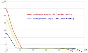 David Auerbach has described an effect that he observed in samples in glass beakers placed into a liquid cooling bath. In all cases the water supercooled, reaching a temperature of typically −6 to −18 °C (21 to 0 °F; 267 to 255 K) before spontaneously freezing. Considerable random variation was observed in the time required for spontaneous freezing to start and in some cases this resulted in the water which started off hotter (partially) freezing first.[11]