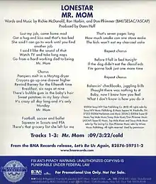 "Mr. Mom" is a song written by Ron Harbin, Richie McDonald and Don Pfrimmer, and recorded by American country music band Lonestar. It was released in July 2004 as the second single from their fifth studio album Let's Be Us Again. The song reached the top of the Billboard Hot Country Singles & Tracks chart on November 20, and is their last number one hit to date.[1]