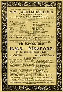 Mrs. Jarramie's Genie is a one-act comic opera with a libretto by Frank Desprez and music by Alfred Cellier and François Cellier. The piece was first presented at the Savoy Theatre on 14 February 1888,[1] as a curtain raiser to the revival of H.M.S. Pinafore (November 1887 – March 1888). It was subsequently presented as a curtain raiser to revivals of The Pirates of Penzance (March – June 1888) and The Mikado (June – September 1888), and then with The Yeomen of the Guard (October 1888 – November 1889).