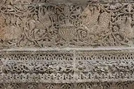 The imagery used on the Mshatta facade, like much early Islamic art, draws inspiration from different historical referents. The grape vine, acanthus leaf, and amphora motifs provide a clear link to Greco-Roman and Byzantine visual culture. These motifs were consistently used in Byzantine churches, as well as early Umayyad monuments like the Dome of the Rock in Jerusalem.[5] Some of the mythical creatures depicted in the relief also come from Greco-Roman origins, like the griffin and centaur. One section of the facade contains a central image on the bottom register of a griffin and another creature with the head of a dog and tail of a peacock. This creature has been identified as a simurgh from Zoroastrian mythology. The appearance of a Zoroastrian mythical creature suggests that visual culture from the Sasanian Empire influenced the design of the Mshatta facade. This is further supported by the vegetal imagery on the right side of the facade. Among the grape vines are pine cone-like buds and winged palmettes that draw reference to the iconic crown of the Sasanian kings.[5]