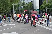 Muévete en Bici (Move by Bike, Get On Your Bike,[1] or Move on Bikes[2] in English) is an active mobility program in Mexico City. More than 20 million people annually participate in the open-streets events, with between 20,000[3] and 80,000[4] people participating weekly as public thoroughfares are closed to motor vehicles and therefore opened to all other travelers.[5][6] Muévete currently uses 55 kilometres (34 mi)[2] of roads through the center of the city.[7] The program has become a popular way for tourists to take in the historic sites[8] of Mexico City along Paseo de la Reforma.[9]