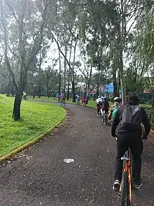 Muévete is an example of a ciclorecreovía (or ciclovía recreativa),[10] a temporary weekend or weeknight recreational bike path that is an intermediate step toward a comprehensive bicycle infrastructure in the Americas.[11] The program is run by the Secretary of the Environment of the Federal District, created with the aim of promoting sustainable mobility (in general, the use of bicycles) and, therefore, improving air quality in Mexico City.[4]