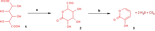Reaction of mucic acid to 3-hydroxy-2-pyrone with a) potassium bisulfate 160 °C / 4 hrs. b) hydrochloric acid to pH = 7