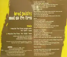 "Mud on the Tires" is a song co-written and recorded by American country music singer Brad Paisley. It was released in September 2004 as the fourth and final single and title track off Paisley's album Mud on the Tires. The song reached number-one on the U.S. Billboard Hot Country Songs chart and peaked at number 30 on the U.S. Billboard Hot 100 chart. It was written by Paisley and Chris DuBois.