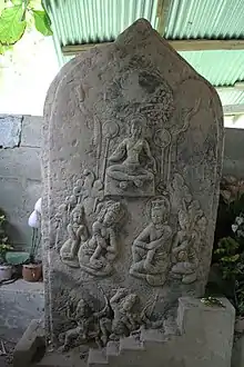 The site of Muang Fa Daet was likely a Buddhist society based on the style of artifacts and features found there. The time period and style of ceramics and Buddhist artifacts found here link the culture to the Davaravati period based on its similarity to other Thailand Davaravati sites.[5] With this site being a Buddhist society it is thought that there was a presence of Monks in the city. Based on the estimated population size there could have been as many as 85-164 men who could have taken on this role without disturbing the aspects of everyday life.[4] The Khmer Empire is also thought to influence the culture and religious themes of Mueang Fa Daet as it spread throughout Thailand.[5] The influence of the Khmer Empire can be seen in the specific pottery styles which included corded patterns, incised sherds, and carinated pots.[6] There is also evidence that this site might have been a place of pottery production with large amounts of clay and remnants of a kiln left behind[7] The narrative art found on many sema stones is also believed to have originated in Mueang Fa Daet.[4] The appearance of narrative art sema stones is very limited with the site of Muang Fa Daed having the largest number with a total of 15.[4]