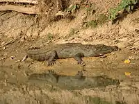 The distribution of the mugger crocodile overlaps with that of the saltwater crocodile in a few coastal areas, but it barely enters brackish water and prefers shallow waterways.[19][64][65][66] It is an apex predator in freshwater ecosystems.[67] It is sympatric with the gharial (Gavialis gangeticus) in the Rapti and Narayani Rivers, in the eastern Mahanadi, and in tributaries of the Ganges and Yamuna rivers.[31][68][36]