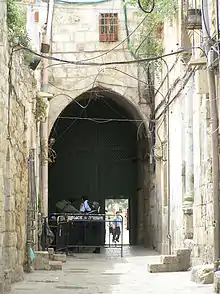 The Iron Gate (باب الحديد Bāb al-Ḥadīd, Hebrew: Shaar Barzel) is located on the western side, at the end of Bab al-Hadid Street, being within the Muslim Quarter, and where, before entering, one gains access to an exposed and contiguous section of the ancient wall of the Temple Mount, known locally as the Little Western Wall.[13]